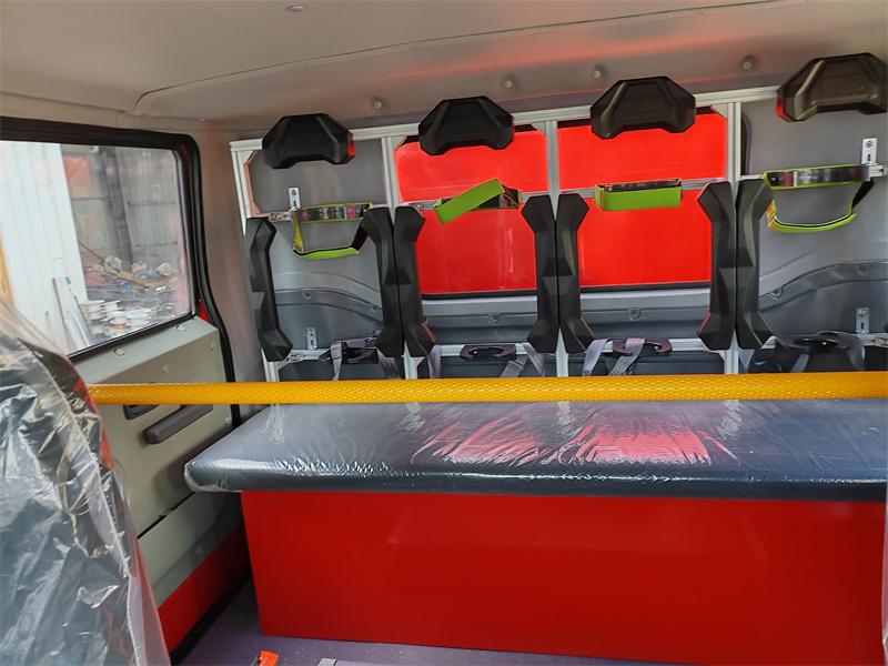 Е Складиштење опреме: Предња просторија за опрему има потпуно затворена врата од алуминијумске легуре са ролетнама, што омогућава организовано складиштење разне ватрогасне опреме, као што су ватрогасна црева, ватрогасне секире, лопате, пијуци, апарати за гашење пожара, ватрогасна одела и мостови за црева, што олакшава брз приступ ватрогасцима.